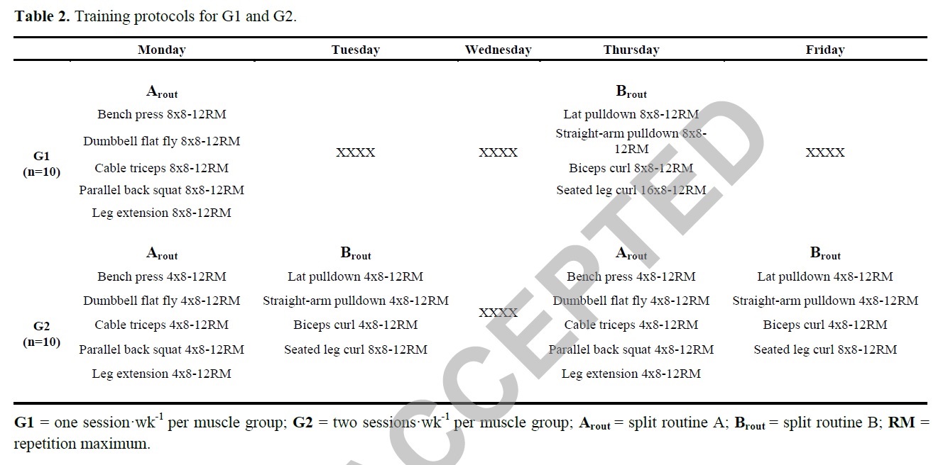 Participants were randomly assigned in 2 experimental groups: 1 session·wk per muscle group (G1, n = 10), where every muscle group was trained once a week with 16 sets or 2 sessions·wk per muscle group (G2, n = 10), where every muscle group was trained twice a week with 8 sets per session. All other variables were held constant over the 8-week study period.