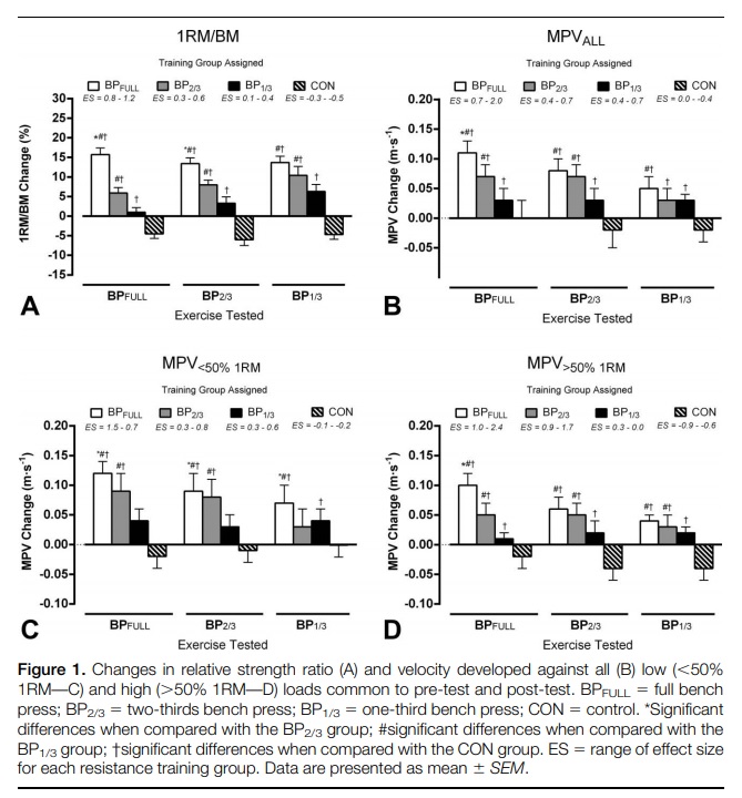 Resultaten talar ett ganska tydligt språk. De deltagare som pressade med full rörelselängd förbättrade sin styrka mer än de som begränsade den. Dessa förbättringar var inte bara uppenbara i mätningar av 1RM-styrkan, utan över hela spektrat av intensitet och rörelsehastighet. Deltagarna i 2/3-gruppen uppvisade näst bäst förbättringar, medan ökningarna hos 1/3-gruppen var rätt dåliga överlag.