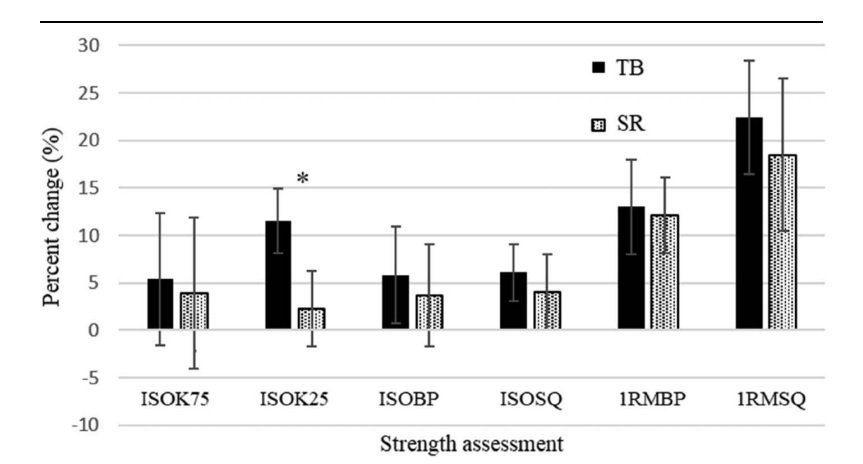 Både deltagarnas isokinetiska och dynamiska styrka fastställdes före och efter träningsprogrammen. Deras koncentriska isokinetiska styrka testades med flera hastigheter, liksom deras isometriska styrka i knäböj och bänkpress mot en fixerad stång. Dynamisk styrka mättes i parallella knäböj och bänkpress, med fem försök med tre minuters vila mellan varje lyft.