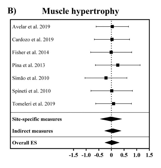 Sju studier tittade på muskeltillväxten. Här såg forskarna ingen signifikant effekt beroende på övningarnas ordning. Varken analyser av områdesspecifika mätningar (magnetresonanstomografi, datortomografi, ultraljud och muskelbiopsier) eller indirekta mätningar av hypertrofi (DXA, undervattensvägning, bioimpedans, pletysmografi och kalipermätning) avslöjade några effekter av övningarnas ordning på muskeltillväxten.