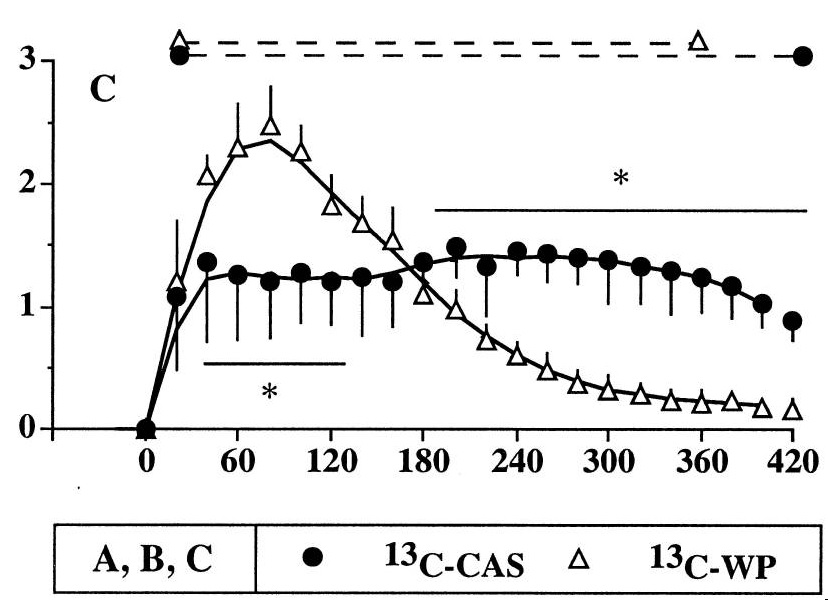 Trianglarna visar nivåerna av leucin i blodet efter intag av 30 gram vassleprotein, medan de svarta cirklarna visar nivåerna efter intag av samma mängd kaseinprotein, under 420 minuter.