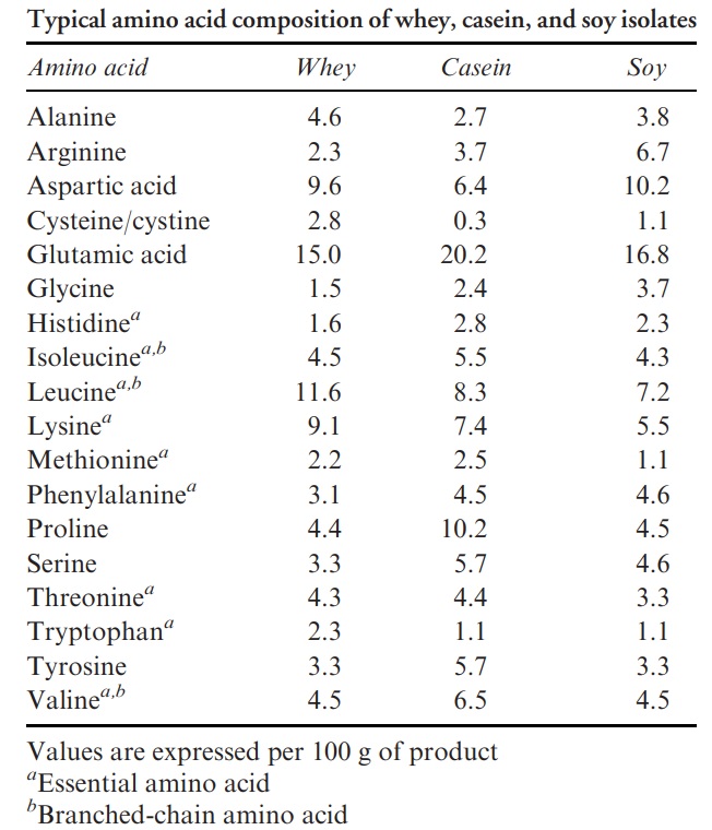 Så här ser sammansättningen av aminosyror i kaseinprotein (mittenspalten) ut, jämfört med vassleprotein och sojaprotein.