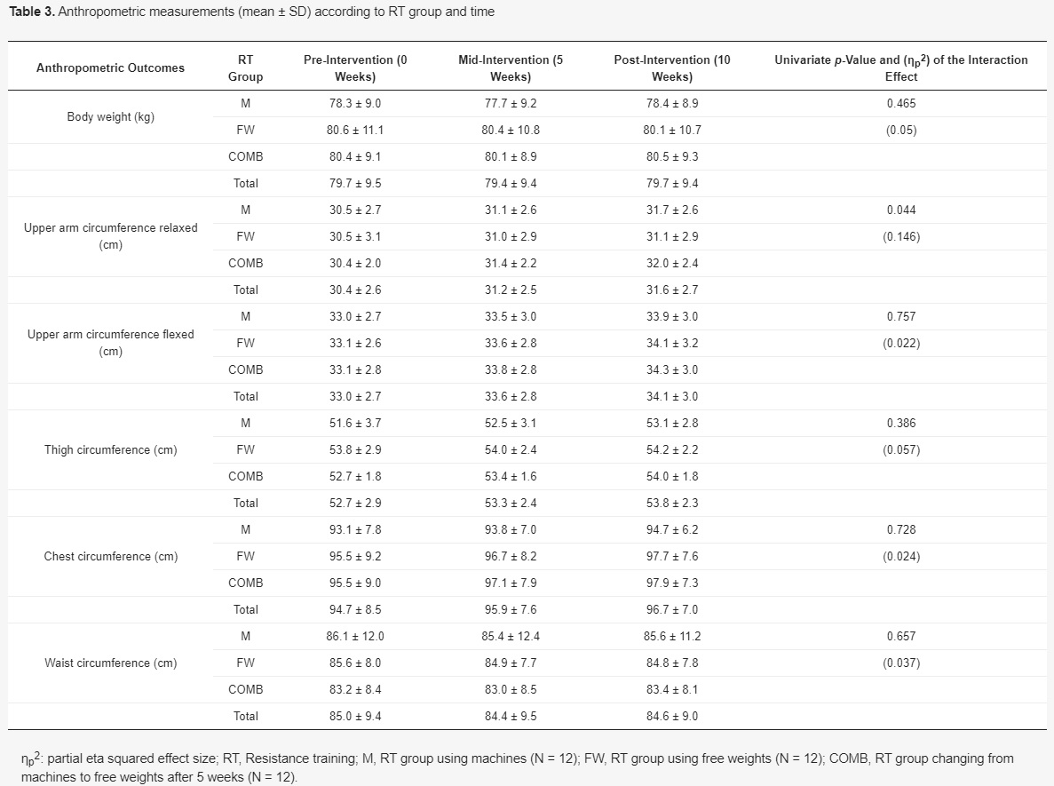 Samtliga grupper uppvisade likvärdiga ökningar av deltagarnas armmått, lårmått och bröstmått vid både fem och tio veckor. Tio veckor är tillräckligt lång tid för mät- och märkbar muskeltillväxt hos nybörjare. Det faktum att deltagarnas midjemått inte ökade antyder att det handlar om fettfri massa de lade på sig. Med tanke på mätmetodens tillförlitlighet, eller snarare bristen på denna, är det dock snarare uppskattning av muskelstorleken det handlar om än några exakta siffror.