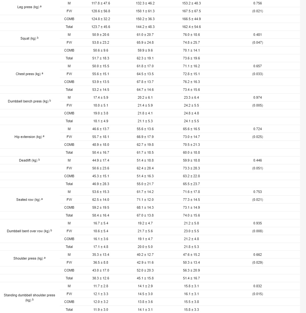Resultaten visade att deltagarna i alla tre grupperna uppvisade lika stora ökningar av styrkan. Oavsett om de tränade med enbart fria vikter, enbart med maskiner, eller kombinerade både fria vikter och maskiner, ökade alla sin 1RM-styrka med mellan 27 och 43 % beroende på övning och muskelgrupp under de 10 veckorna studien varade.