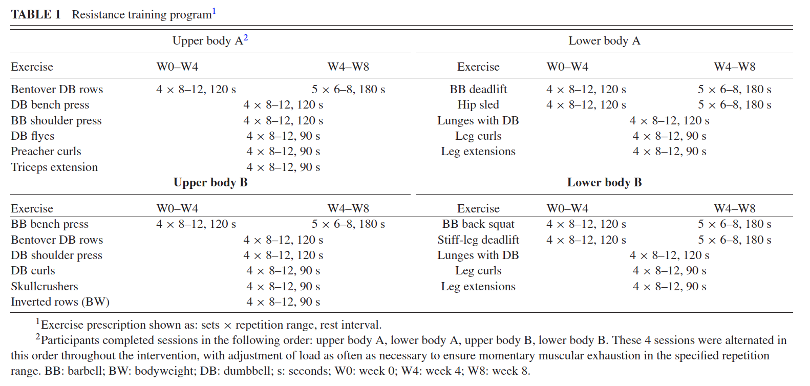Studien varade alltså i åtta veckor, och under de åtta veckorna fick alla deltagare träna efter ett förutbestämt styrketräningsupplägg. De alternerade mellan fyra olika träningspass, två för överkroppen och två för underkroppen. Intruktörer övervakade träningspassen och uppmanade deltagarna att ta alla set till failure. Vid behov justerade de belastningarna så att repetitionsantalet hamnade någonstans inom de specificerade intervallen.