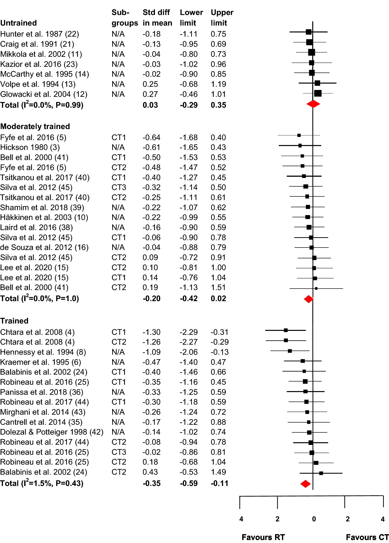 Som du kan se är det ganska jämnt för otränade. Hos medeltränade lutar det åt att enbart styrka är bättre. Resultaten för redan tränade visar klart på en fördel med att bara träna styrka.