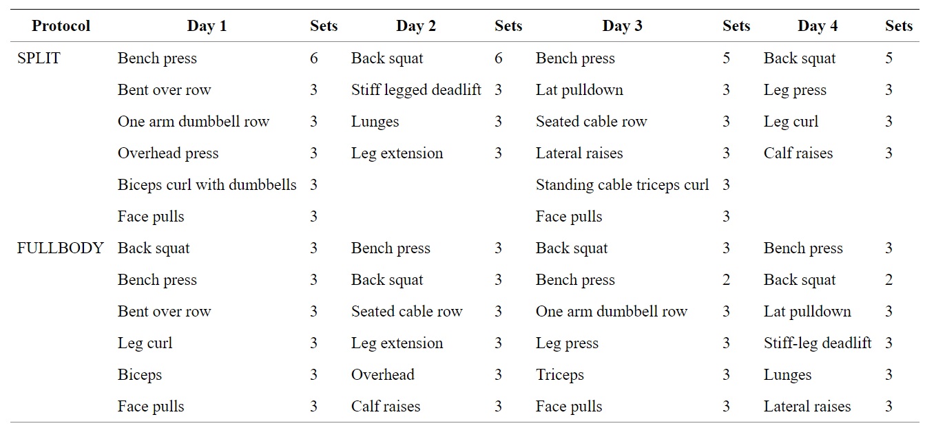 Den första gruppen, splitgruppen, delade upp sin träning på två pass baserade på knäböj plus olika övningar för underkroppen samt två pass med bänkpress som bas, kompletterad med andra övningar för överkroppen.